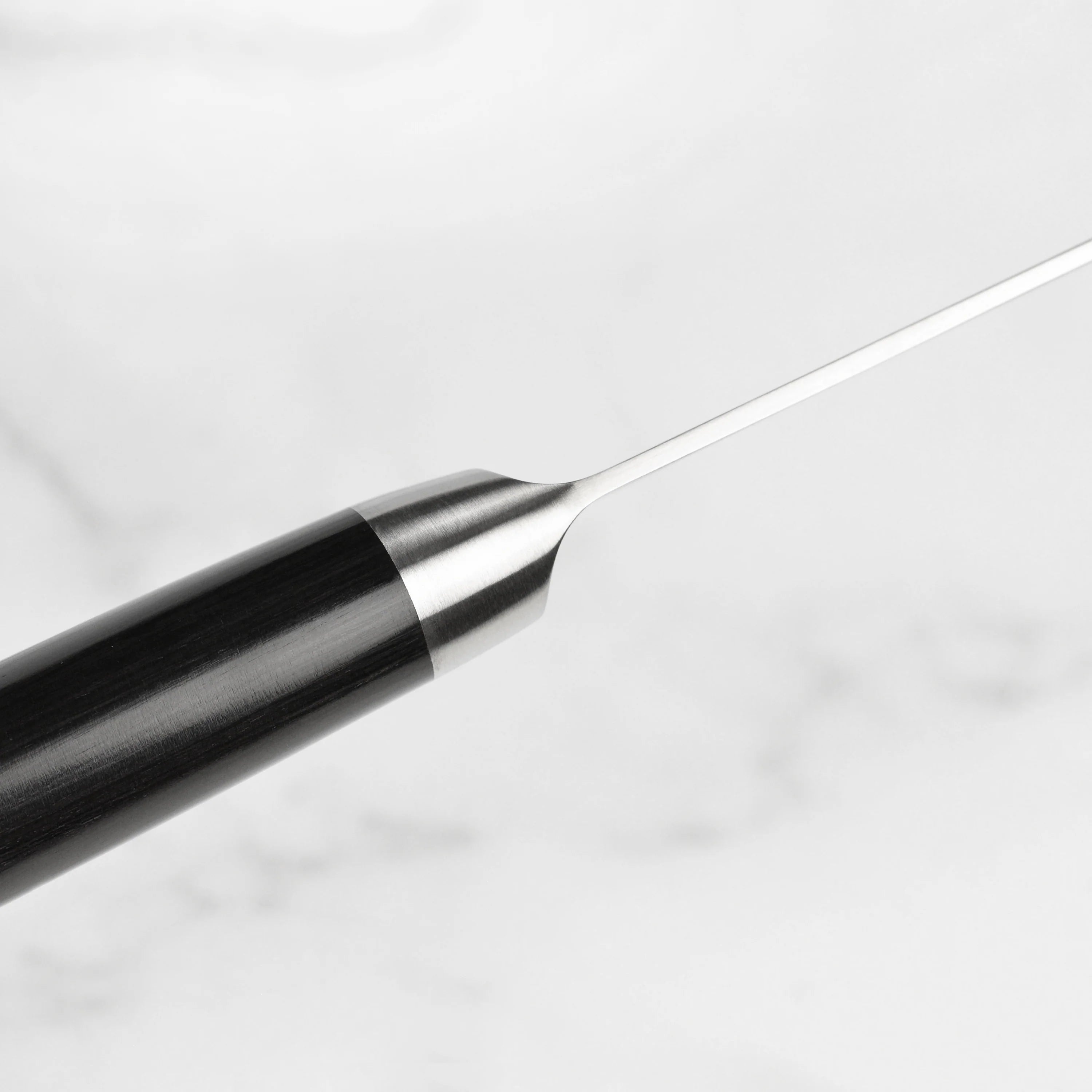 A santoku is a Japanese all-purpose kitchen knife. Like a chef's knife, the santoku is used for just about every cutting job in the kitchen. The name means "three virtues". Depending on who you ask, the name refers either to the three types of foods it works well with - vegetables, proteins, and fruit - or for the three types of cuts at which it excels - slicing, dicing, and chopping.