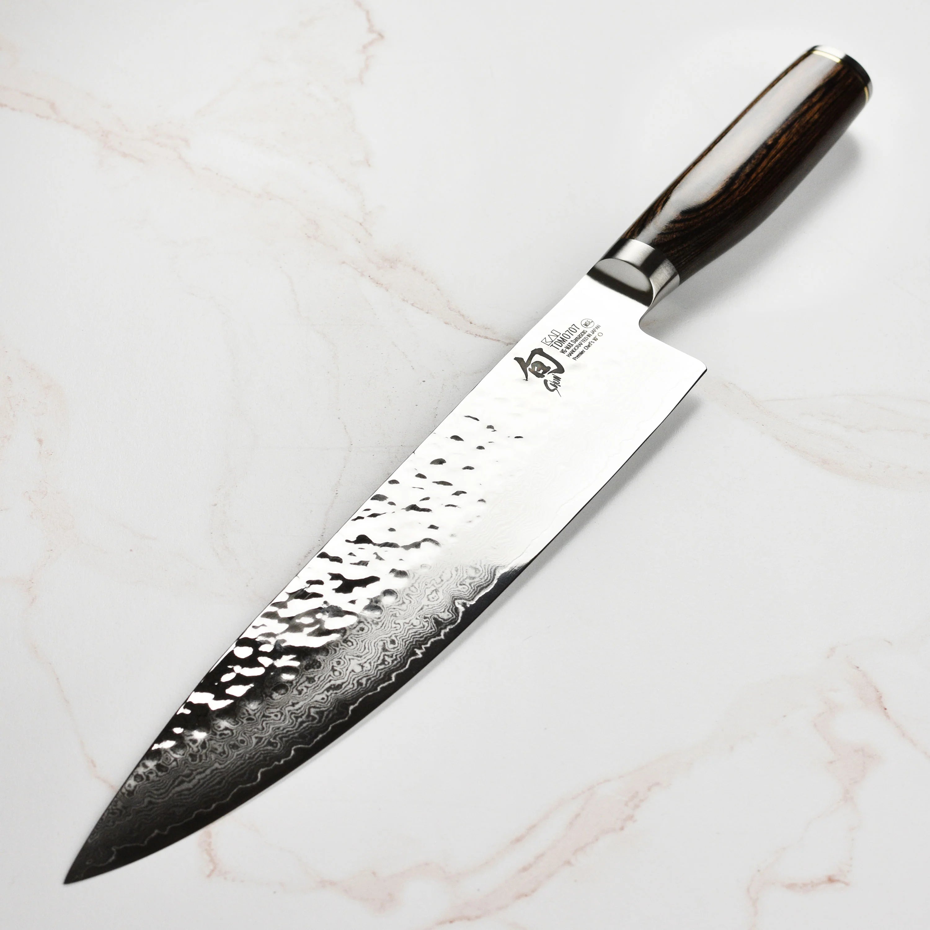 The Shun Premier 10" Chef's Knife is the only all-purpose knife you will need in your kitchen. This Chef's Knife is ideal for a wide variety of cutting tasks including slicing, dicing, and chopping just about anything in the kitchen. The 8" blade is perfect for preparing fruits, vegetables, proteins, and other foods. The wide blade keeps knuckles off the cutting board and is extra handy when transferring cut food from board to pan. With its curved belly, the Chef's knife can be gently "rocked" through fresh herbs or spices to produce a very fine mince. The PakkaWood Handle offers comfort and control and is made of genuine hardwood impregnated with resin, making it moisture resistant, strong, and durable.