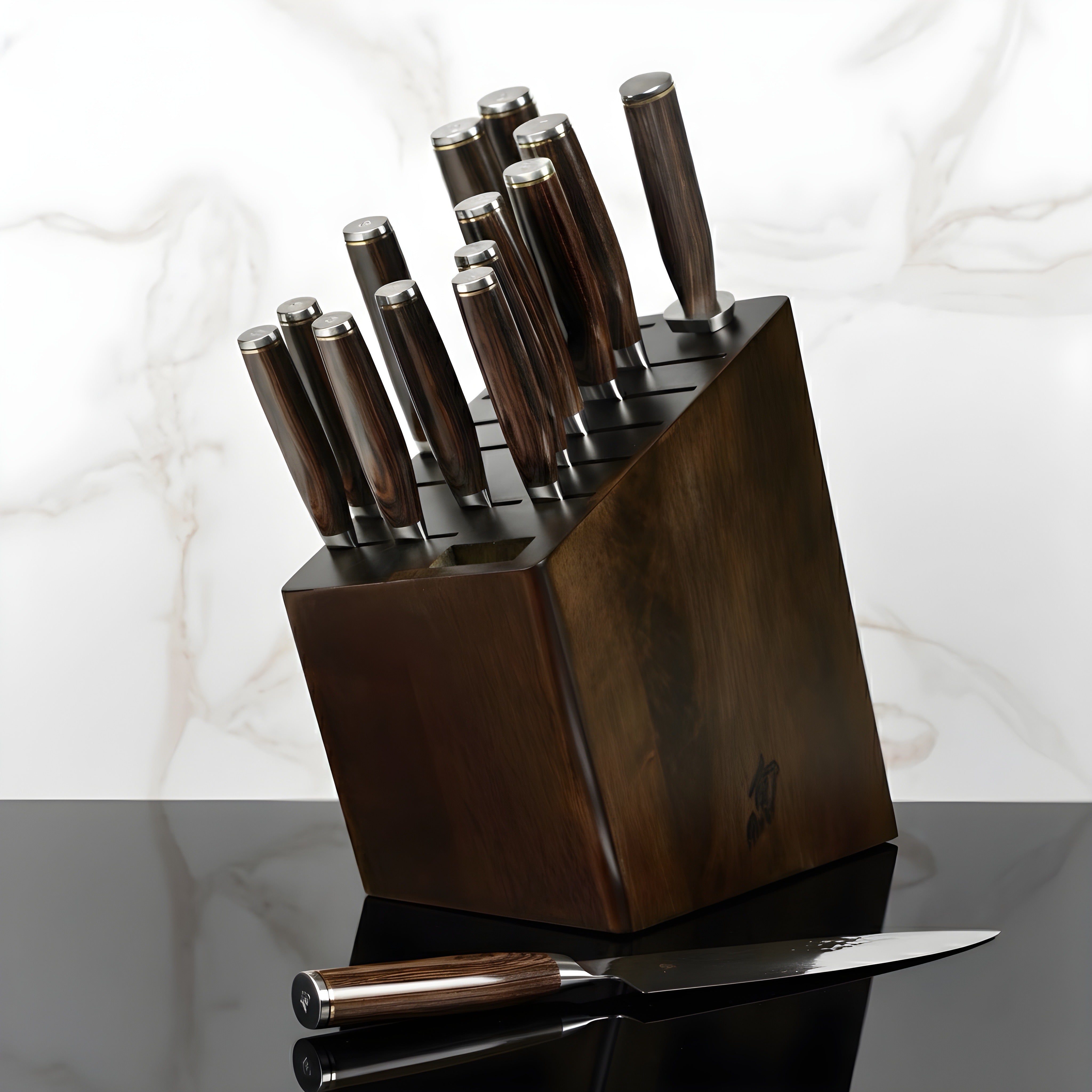 Shun cutlery is made from ultra-hard high-performance steels so Shun blades can be made thinner, lighter and sharper. The patented Composite Blade Technology allows Shun to combine the best characteristics of two steels in one blade, permanently joining different steels in one blade. The incredibly sharp 16° cutting angle of Shun knives makes slicing and dicing easy while preserving your blade for many years to come. The Hammered Tsuchime finish creates tiny pockets of air that act as hollow-ground cavities to reduce drag and quickly release food from the blade. Incredibly sharp edges and handcraft aesthetics set Shun knives apart from every other kitchen knife on the market today.