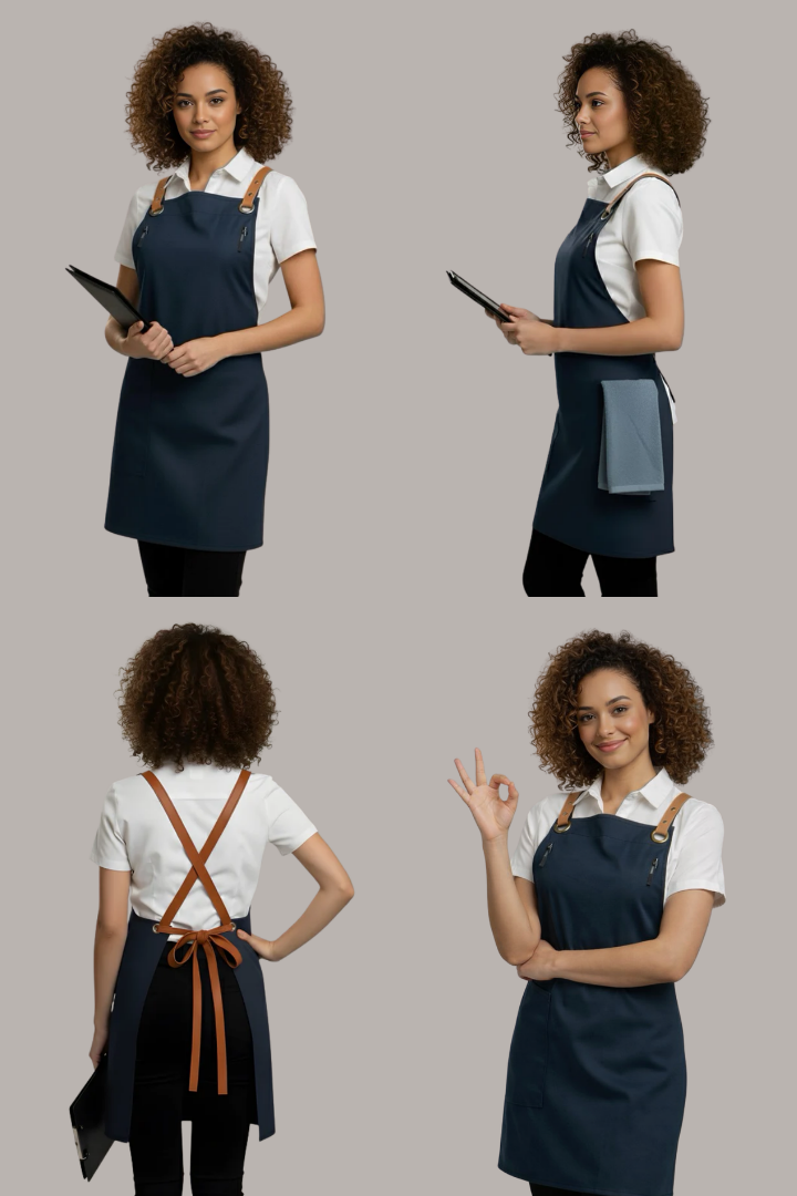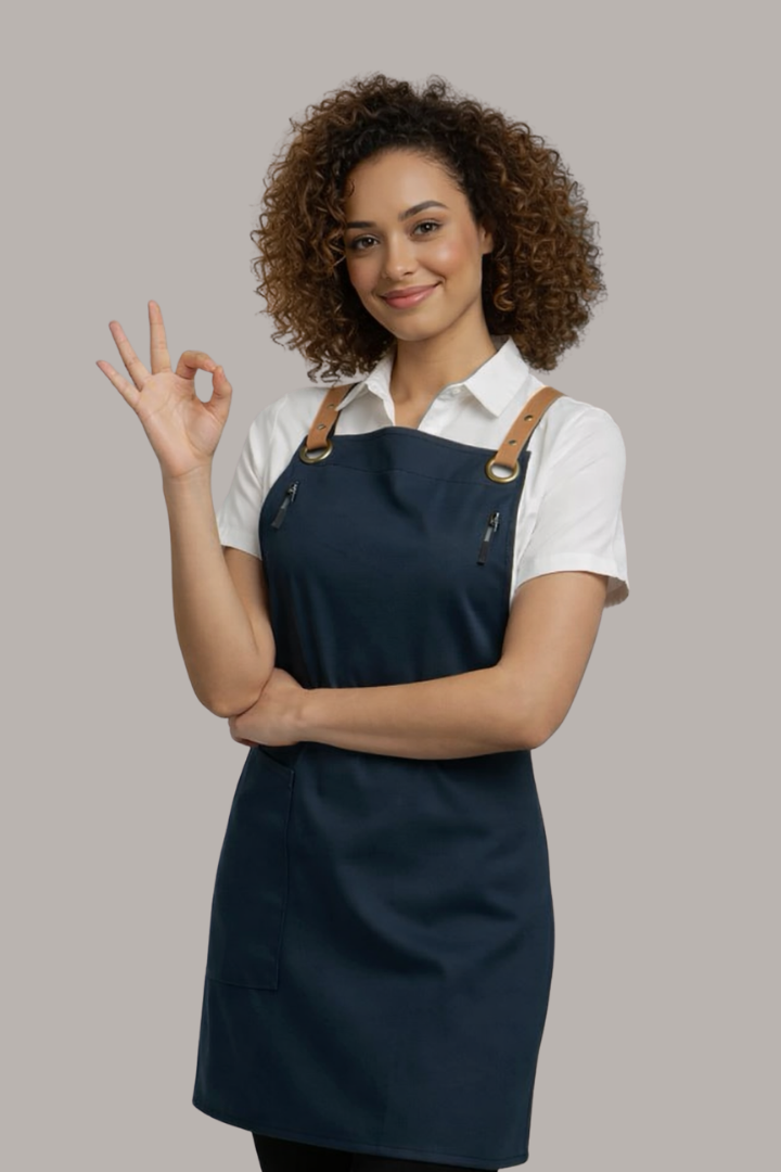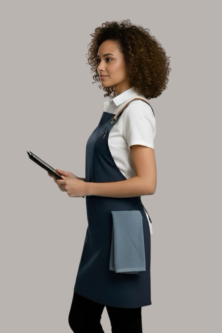 The Bondi Crossover Apron is designed for modern hospitality professionals who need durability, comfort, and a stylish look during long shifts. Made from strong denim fabric, this apron combines practical functionality with a contemporary café and restaurant aesthetic.