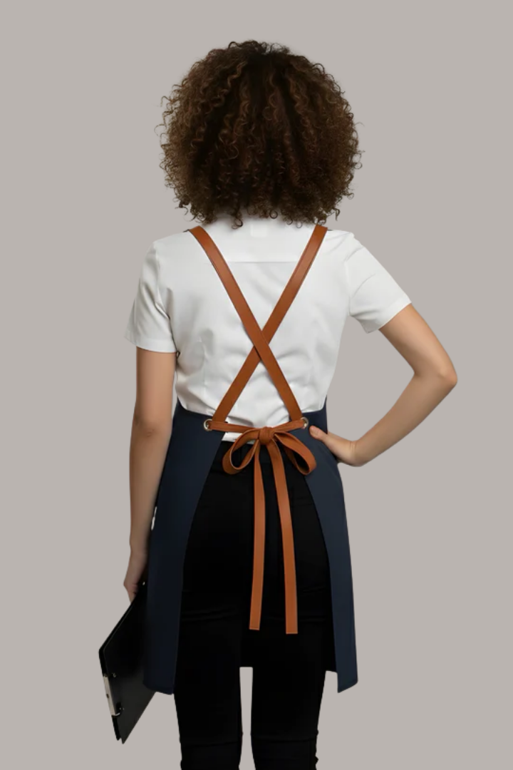 The crossover back design evenly distributes weight across the shoulders, reducing neck strain and allowing greater comfort throughout busy service hours. Its interchangeable strap system with brass eyelets allows you to customise the look of your apron while ensuring a secure fit.