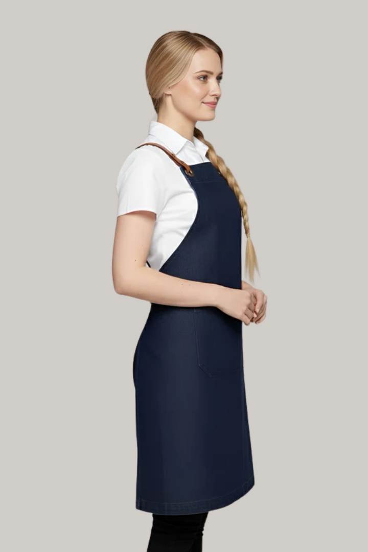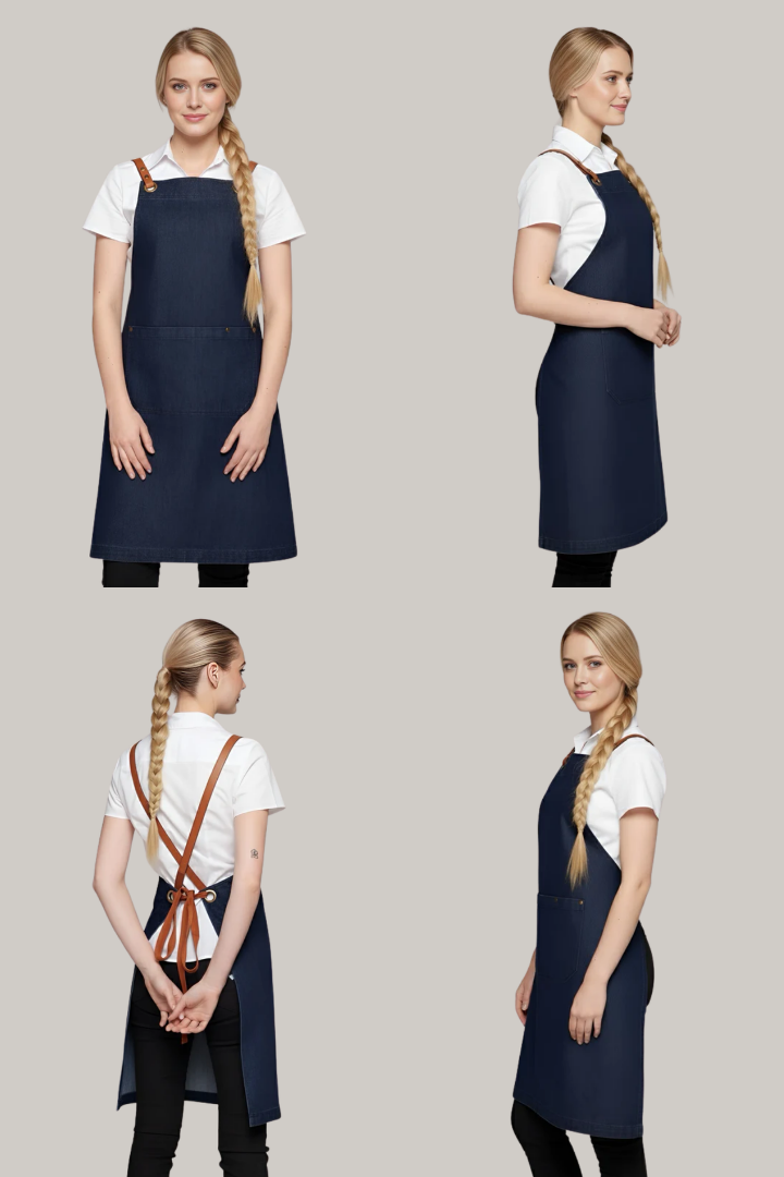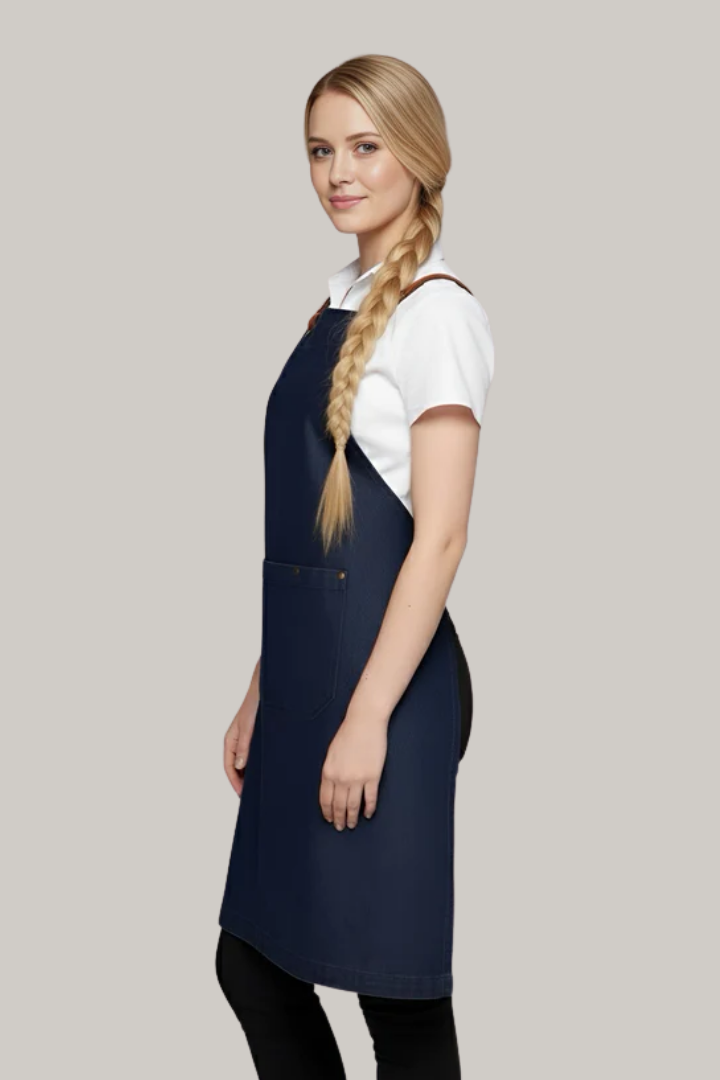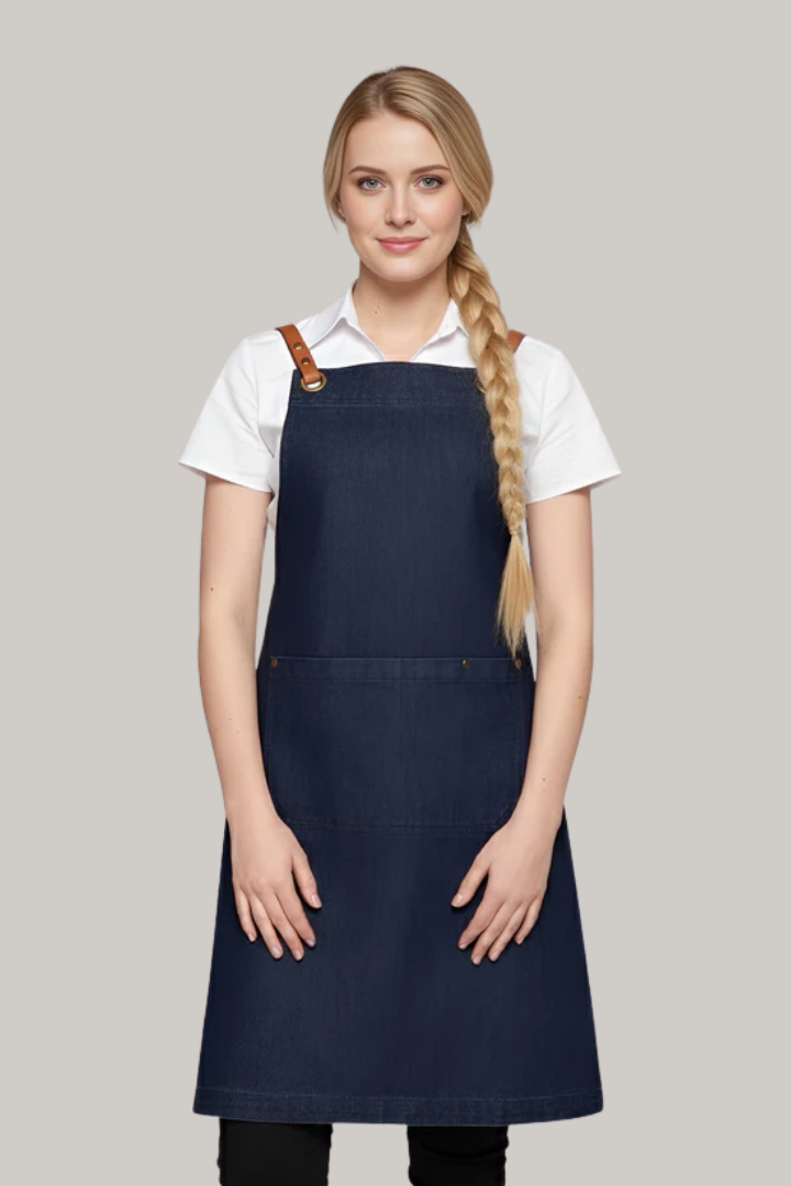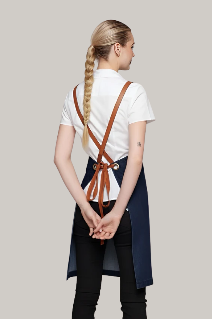 Made from durable denim fabric, it features a crossover back design that distributes weight across the shoulders to reduce neck strain. The interchangeable strap system with brass eyelets and durable PU straps allows you to customize the look while ensuring a secure, comfortable fit. Reinforced bartacks, strong stitching, and spacious utility pockets with pen slots make it practical for chefs, baristas, bartenders, and front-of-house staff in busy hospitality environments.