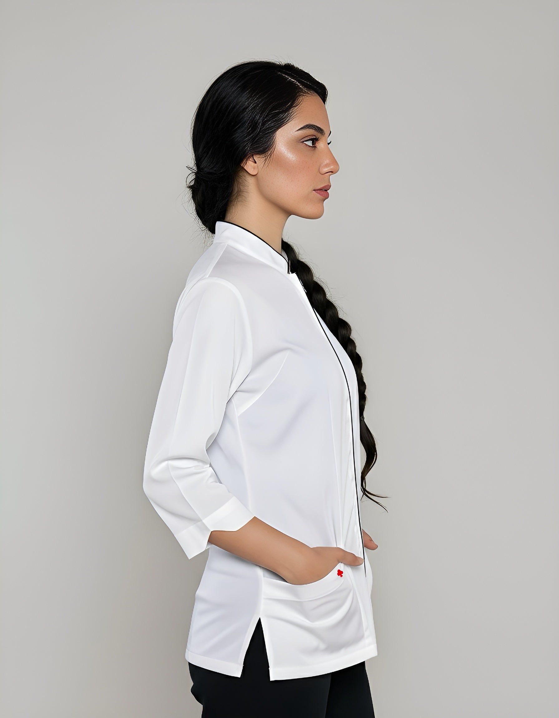 Durable 65% Polyester, 35% CottonSuperior poly/cotton blendCool vents for two-way airflow Black piping detail on the center of the jacketSingle-breasted Tapered fitAvailable in black and white3/4 sleeve Two-arm pocket for sharpie and/or PensPress studs Two hip utility pocketsSide slitsCoat hanger Pre-shrunk and Pre-washed