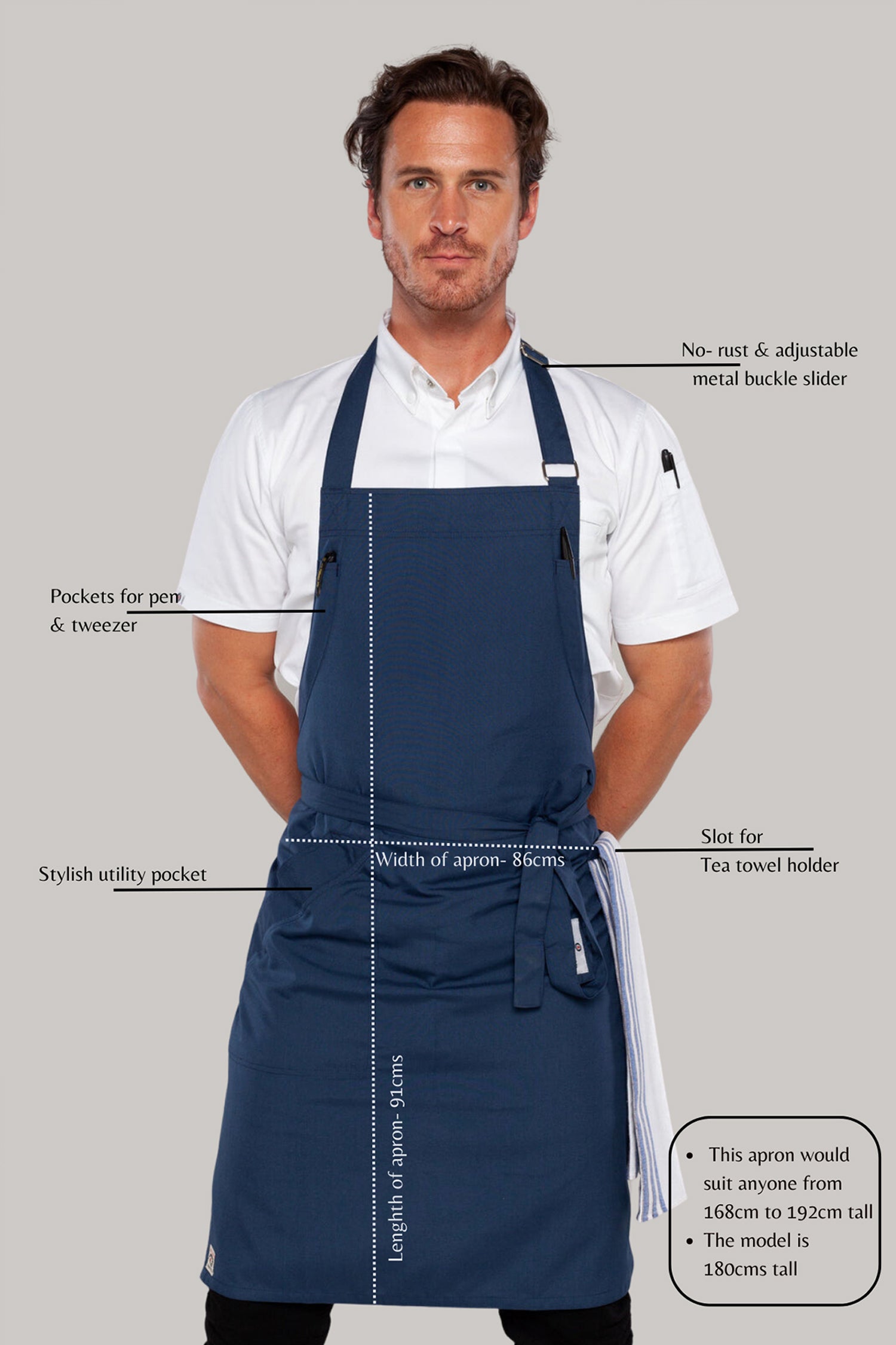 Made from strong poly-blend fabric, it provides reliable protection while remaining lightweight for long service hours. An adjustable metal buckle ensures a customised fit, while reinforced double stitching enhances durability in busy kitchen environments. Practical pockets keep essential tools within reach, and the wide bib coverage with a tapered design offers both functionality and a professional appearance for chefs, baristas, and front-of-house staff.