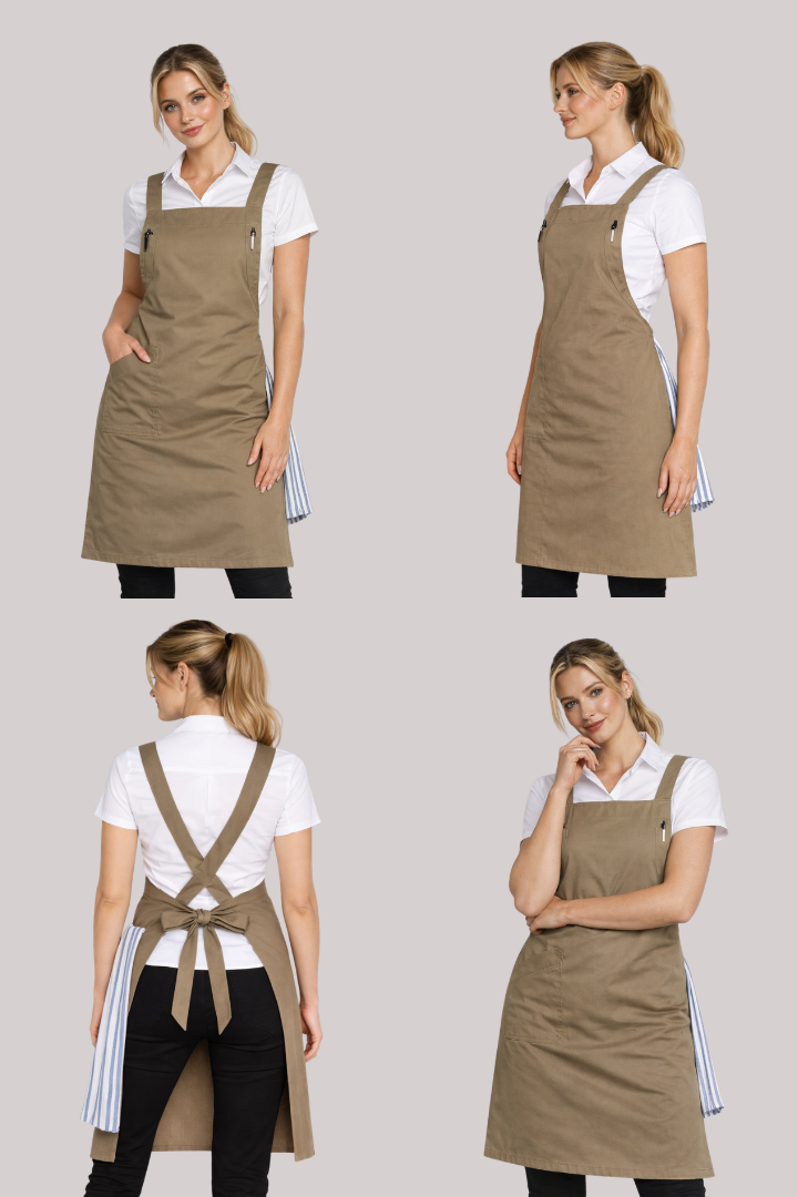 Its cross-over strap design distributes weight evenly across the shoulders, reducing neck strain while ensuring a secure fit. Made from lightweight yet durable fabric with reinforced stitching and bartack pockets, it’s built to handle busy kitchens and cafés.